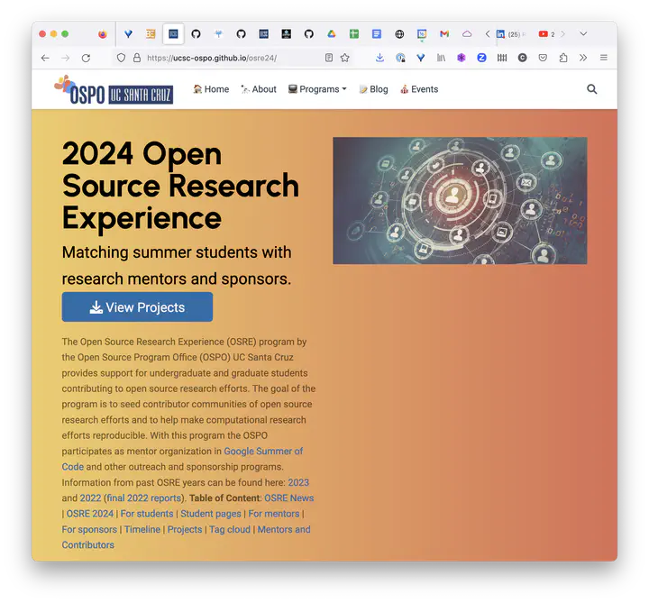 The OSRE is modeled after the Google Summer of Code (GSoC) which matches undergraduate student contributors with mentors working on open source projects. The goal of the OSRE program is to seed contributor communities of UC-based open source research efforts through participation in parallel efforts like GSoC AND to help make computational research efforts reproducible with our NSF funded Summer of Reproducibility. The OSRE leverages our involvement in global programs like GSoC to recruit students from around the world. All students are paid a stipend and mentors are provided administrative and other needed support to allow for a productive summer.