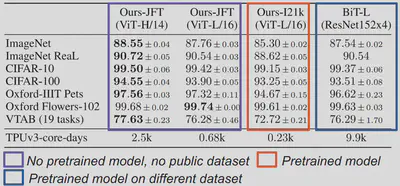 The second material examines the paper “An Image is Worth 16x16 Words: Transformers for Image Recognition at Scale” by Dosovitskiy et al., which introduces a novel way of applying the transformer architecture, which was originally designed for natural language processing, to image recognition tasks. The paper shows that transformers can achieve state-of-the-art results on several image classification benchmarks, such as ImageNet, when trained on large-scale datasets as shown in the following table.